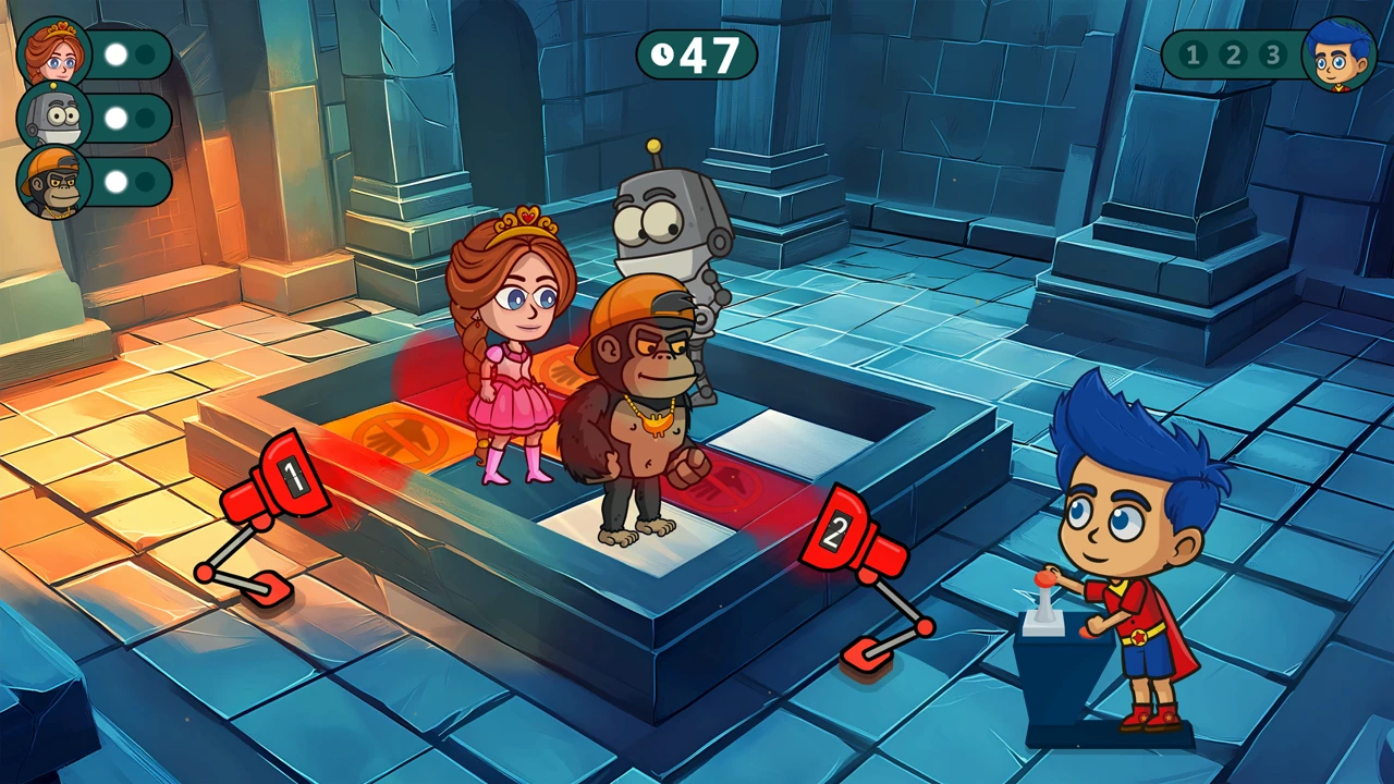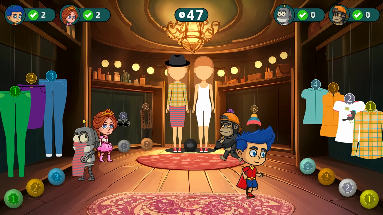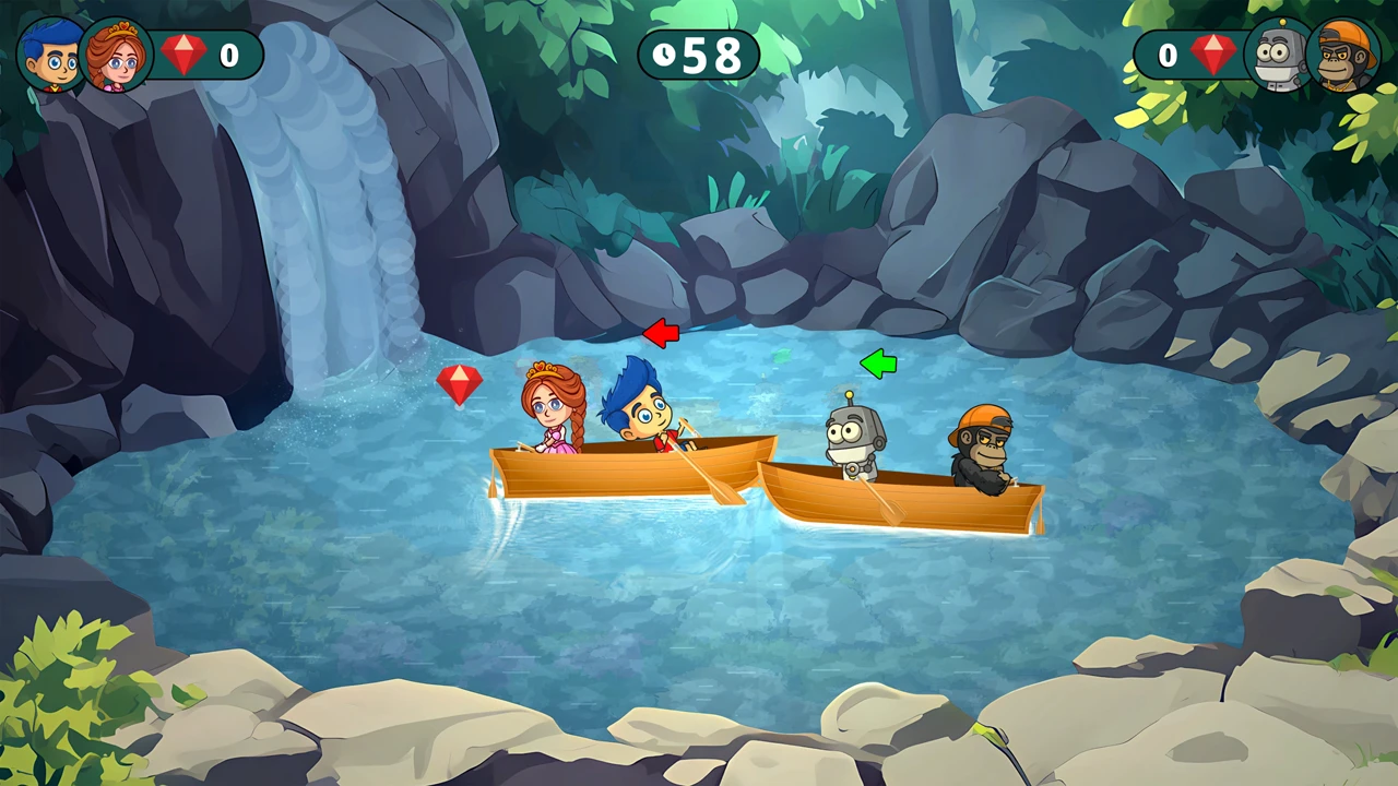 Jump into a vibrant 2D cartoon world featuring 80 quick games across 5 game boards, where kids and adults master educational challenges in math, geography, logic, memory, reflexes, science, chemistry, arts, and anatomy — plus fun games and nostalgic classics — all while competing for crowns and gems!